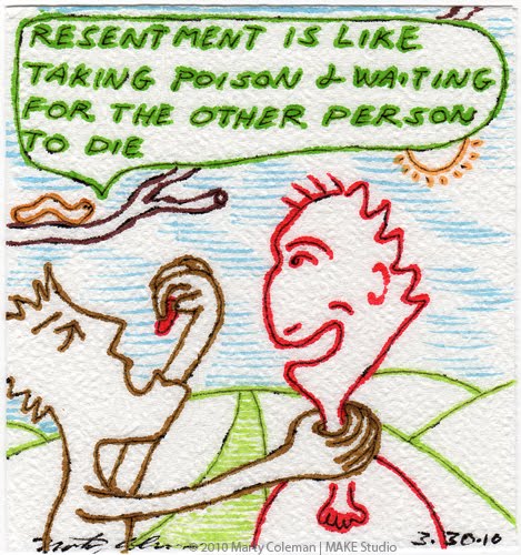 With your mind convinced you are getting back at someone, your hand around their psychological neck, with the free hand you are popping the pill that will kill you. You might be able to make life a bit miserable for the other person, it is true. You might be able to distort their world in the short term. But in the end, the resentment inhabits you, not them, and you will be the one disfigured and distorted by it.